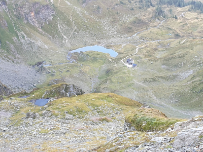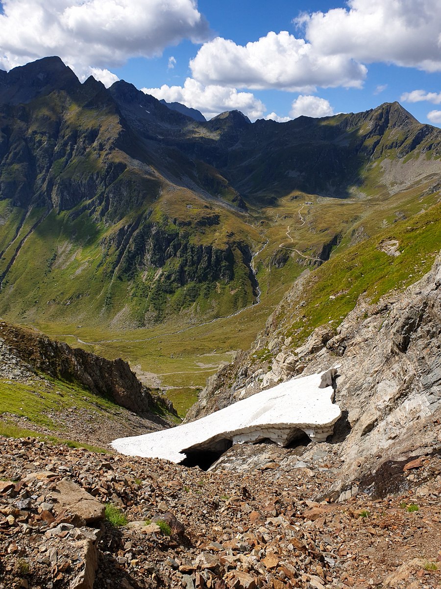 Sobald man durch den Stollen durch ist sieht man auch schon hinunter zur Keinprechthütte, dort haben wir auch übernachtet.